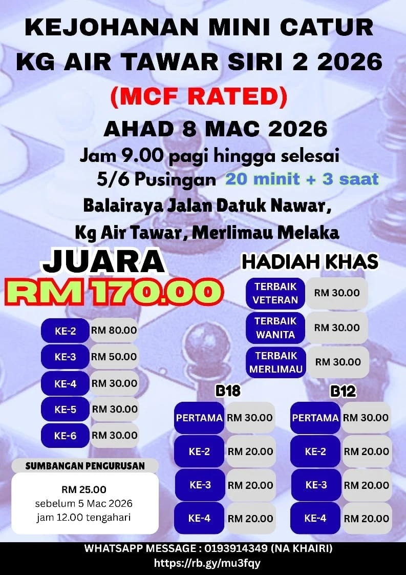 Kejohanan Mini Catur  Terbuka Rapid Individu  Kg Air Tawar 2026 (SIRI 2)